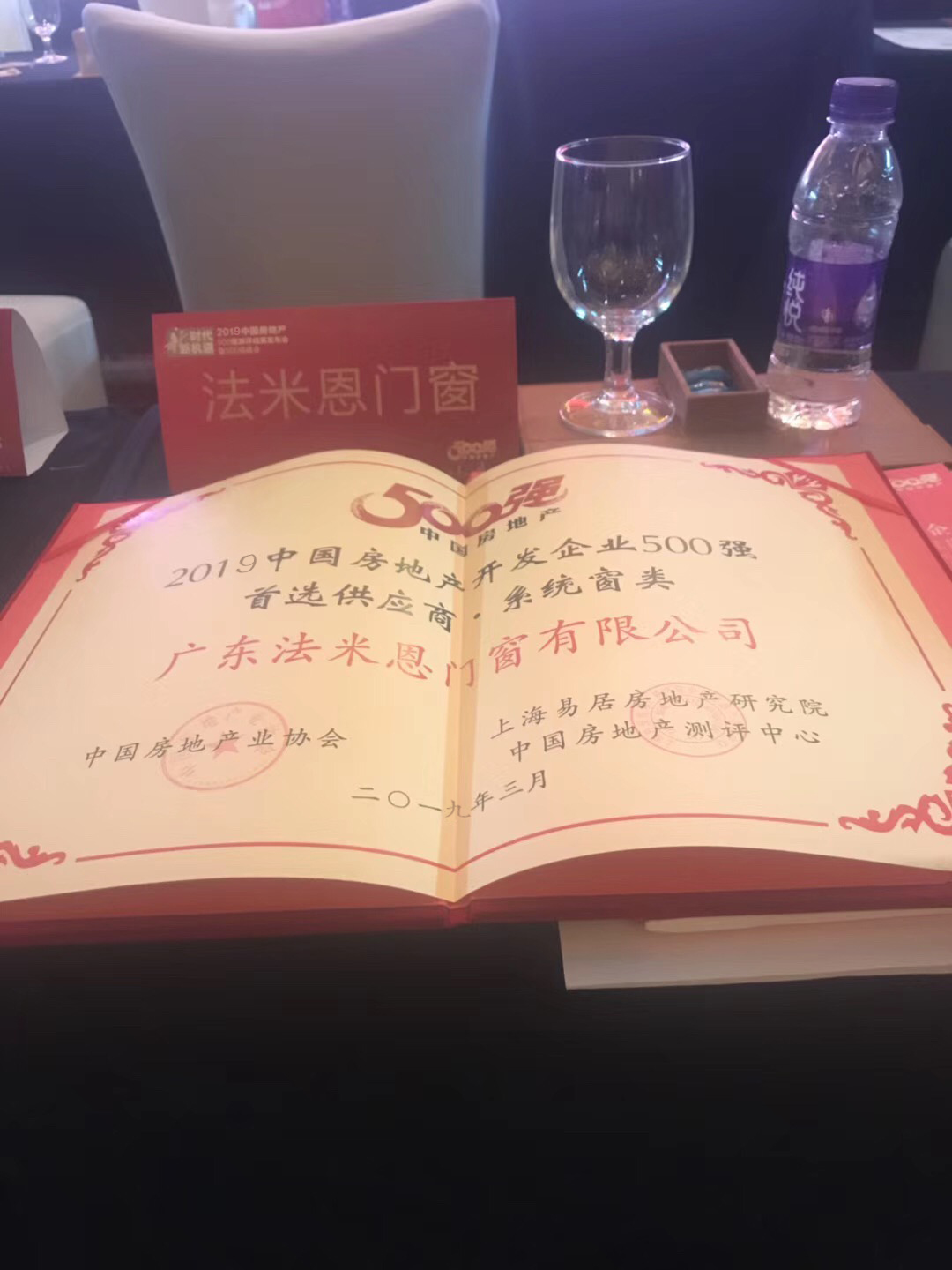 2019年3月20日,2018-2019年度中国房产开发企业500强首选品牌发布,法米恩门窗有限公司“法米恩”荣获2018-2019年度中国房地产开发企业500强首选品牌—幕墙及工程类—系统窗类。